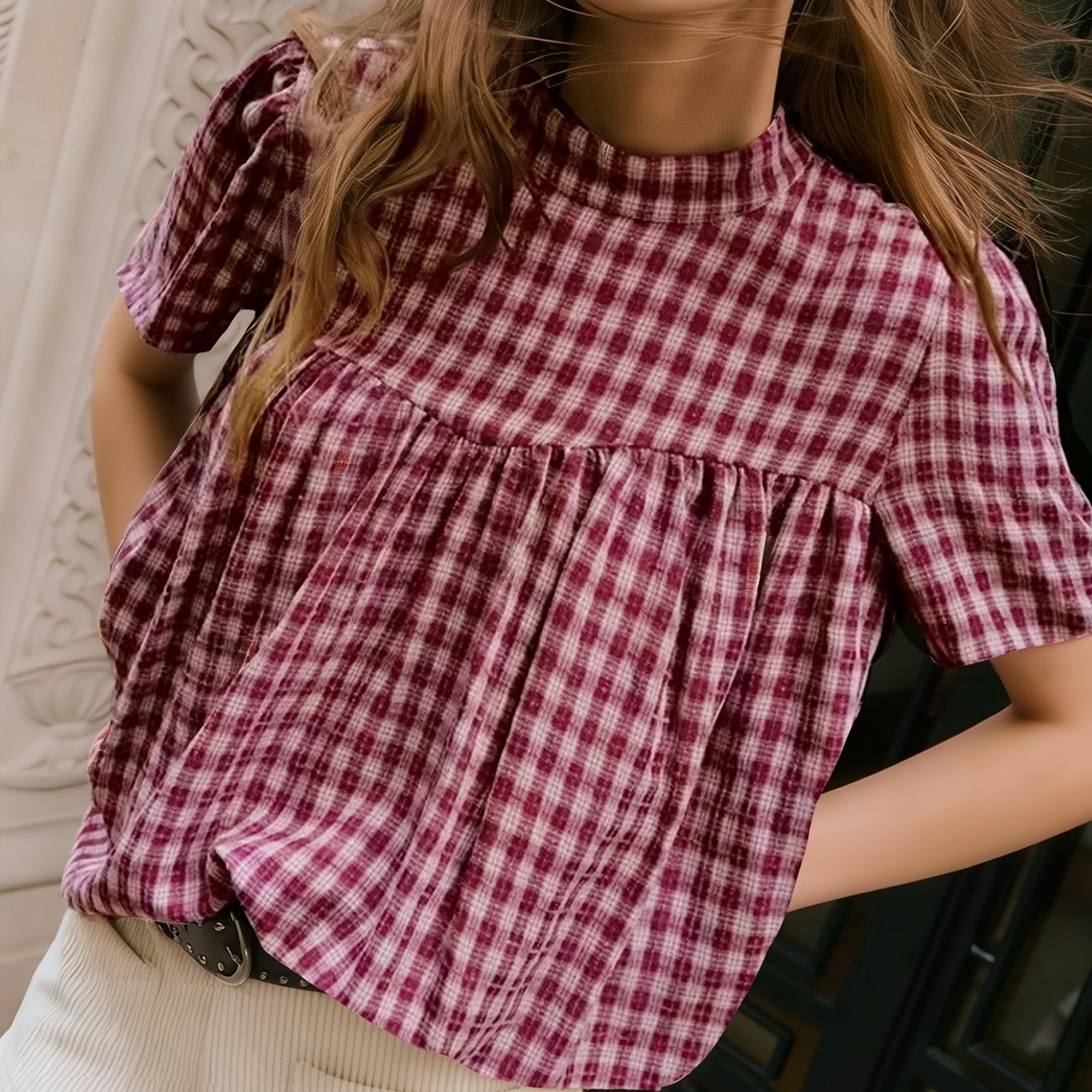 TEMU 우아한 프렌치 체크 반팔 탑 여성 의류, 퍼프 드레스 쉐입 탑 디자인, , 휴가 모임, 축제 파티룩, 바캉스 스타일에 적합