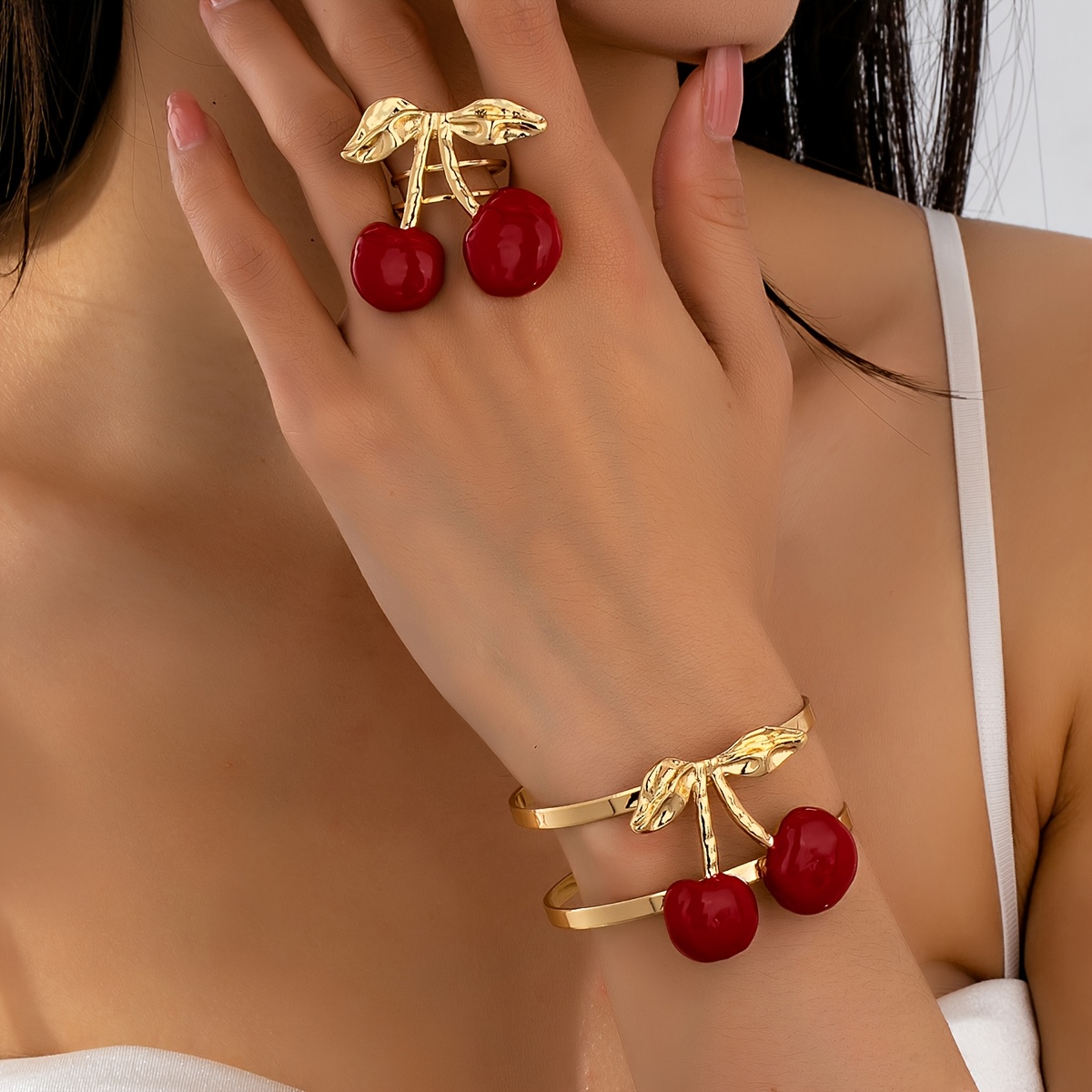 TEMU 1 팔찌 & 1 반지 세트 - 여성 및 청소년용 귀여운 체리 & 녹색 잎 디자인, KC 금도금 조절 가능한 스택 가능 뱅글 & 매칭 링, 봄 여름 일상 캐주얼 액세서리, 섬세한 선물 세트