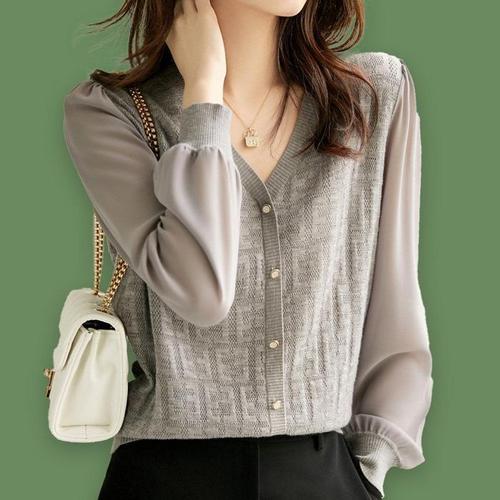 [끌레아]여성 봄 가을 퍼프 소매 긴팔 브이넥 니트 그레이 니트티 v넥 퍼프소매 여자 티셔츠