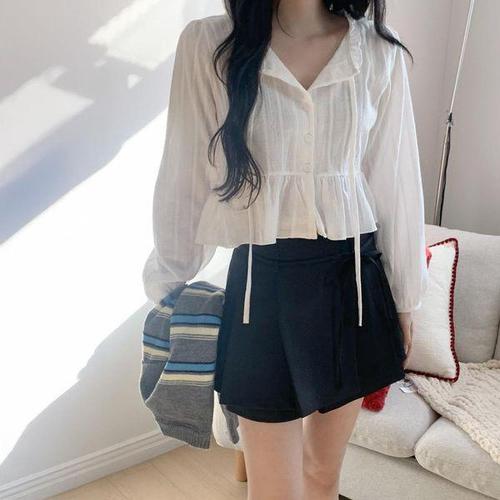 [옷자락] 여자 봄 여름 시원한 리본 프릴 크롭 블라우스
