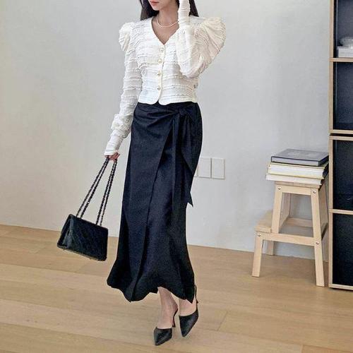 [신상오픈런]여성 오피스룩 퍼프 소매 트위드 브이넥 프릴 가디건