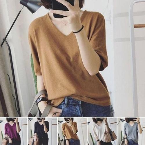 [엄지척]심플 여자 반팔니트 여성 여름 브이넥 니트 반팔티_19677446_667501