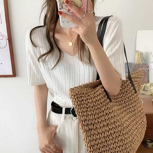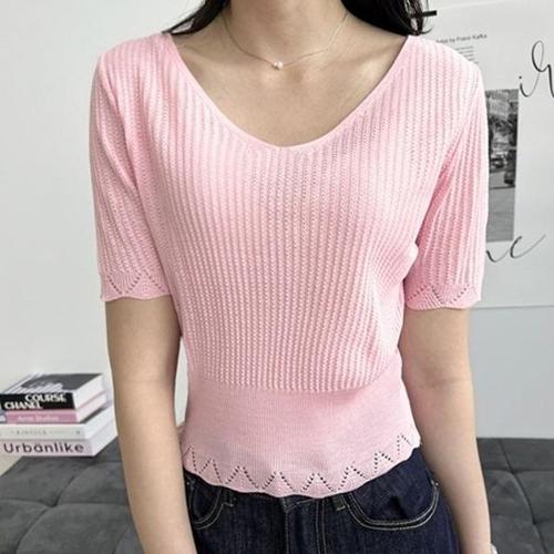 [셀러허브_여성트랜드패션]ONM 반팔니트 봄 여자 골지짜임 브이넥 쿨소재 반팔티