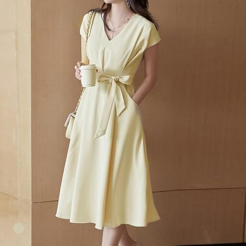 [신상오픈런]여성용 브이넥 반팔 롱 원피스 허리벨트 핀턱 디자인