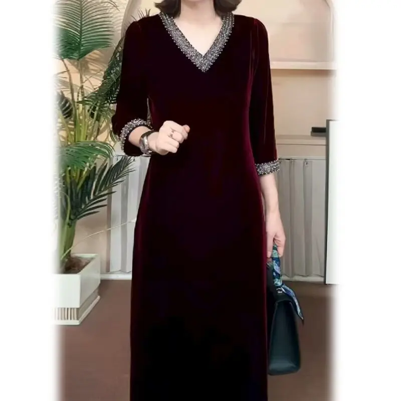 여성 드레스 2025년 신상 봄 가을 인기 라이트 럭셔리 고급 얇은 신축성 엄마 고급 벨벳 드레스 레드 블랙