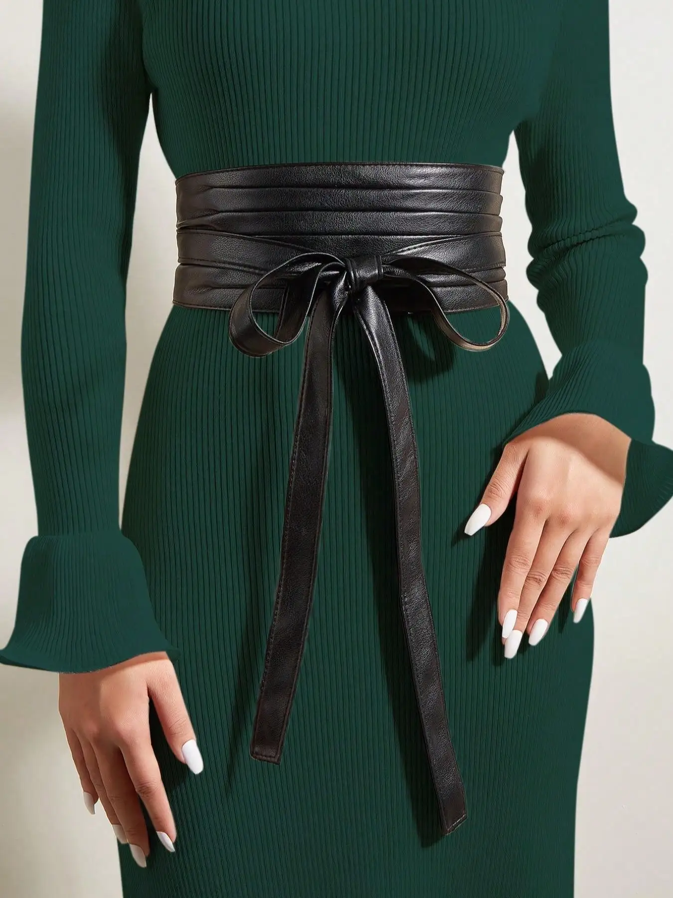 1피스 여성용 캐주얼 솔리드 컬러 PU 매듭 벨트, 궁전 스타일 블랙 타이 허리 조임끈, 보헤미안 우아한 와이드 벨트, 드레스와 매칭하기에 적합, 파티 및 음악 축제에 이상적