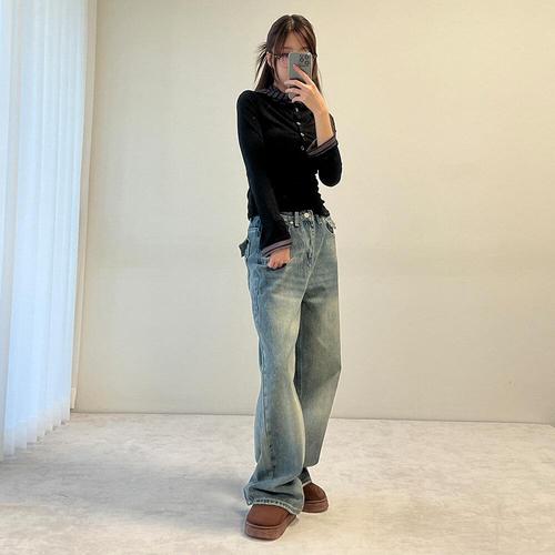 [옷자락]여자 빈티지 워싱 루즈 와이드핏 백포켓 블랙 청바지