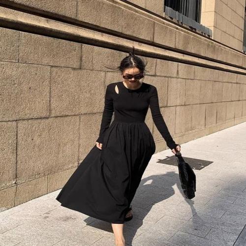 [오너클랜]인기상품 여성 올블랙 페이크 2중 펀칭 A라인 주머니 롱원피스 [WD94072_250916]