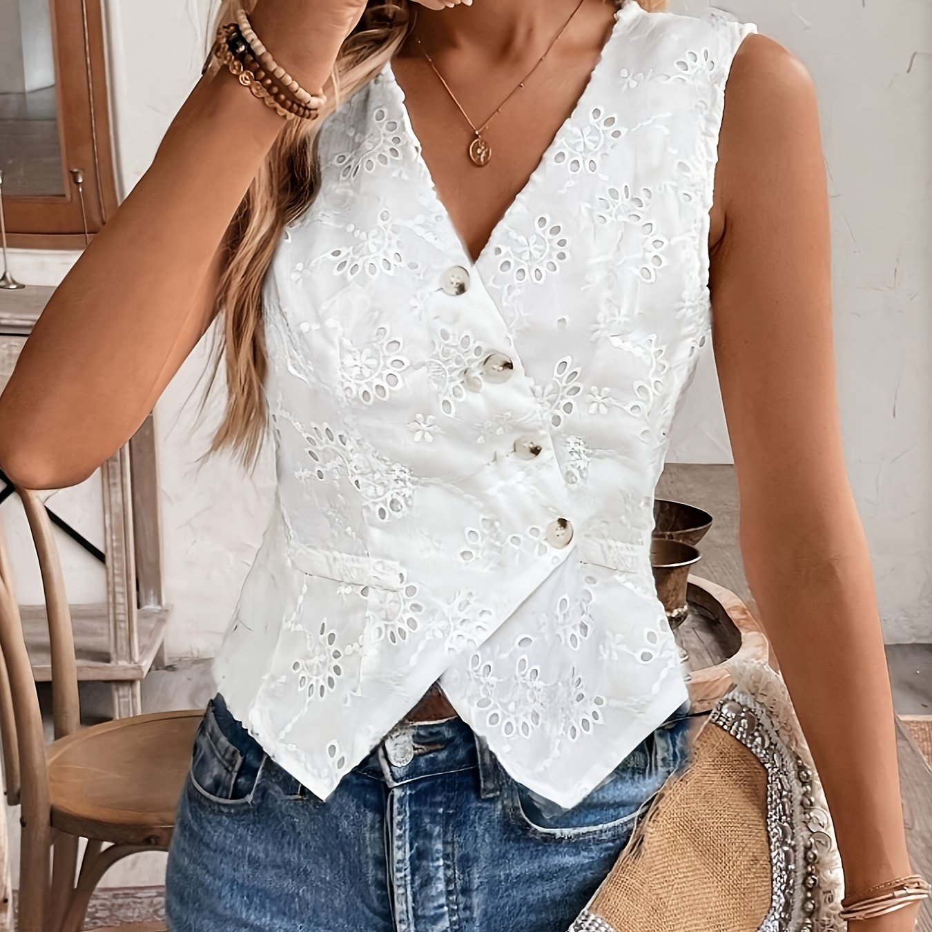 TEMU 1pc 프렌치 스타일 민소매 캐주얼 조끼, 단색 폴리에스테르 V넥 프런트 버튼, 올 시즌 짜임 원단, 우아한 화이트 플로럴 패턴
