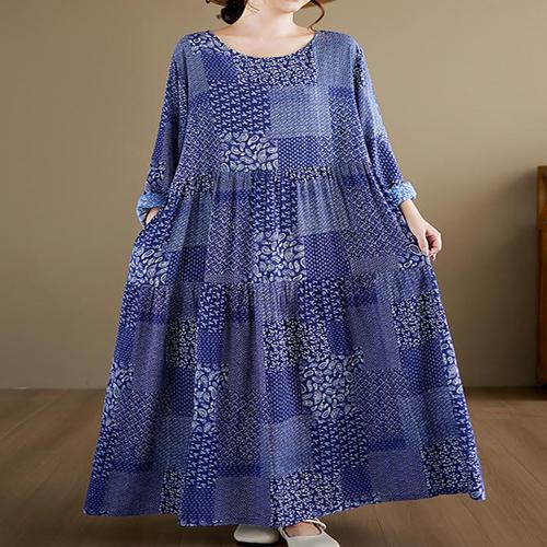 [쿠잉]패치워크 블루 빅사이즈 중년여성 긴팔 롱 원피스