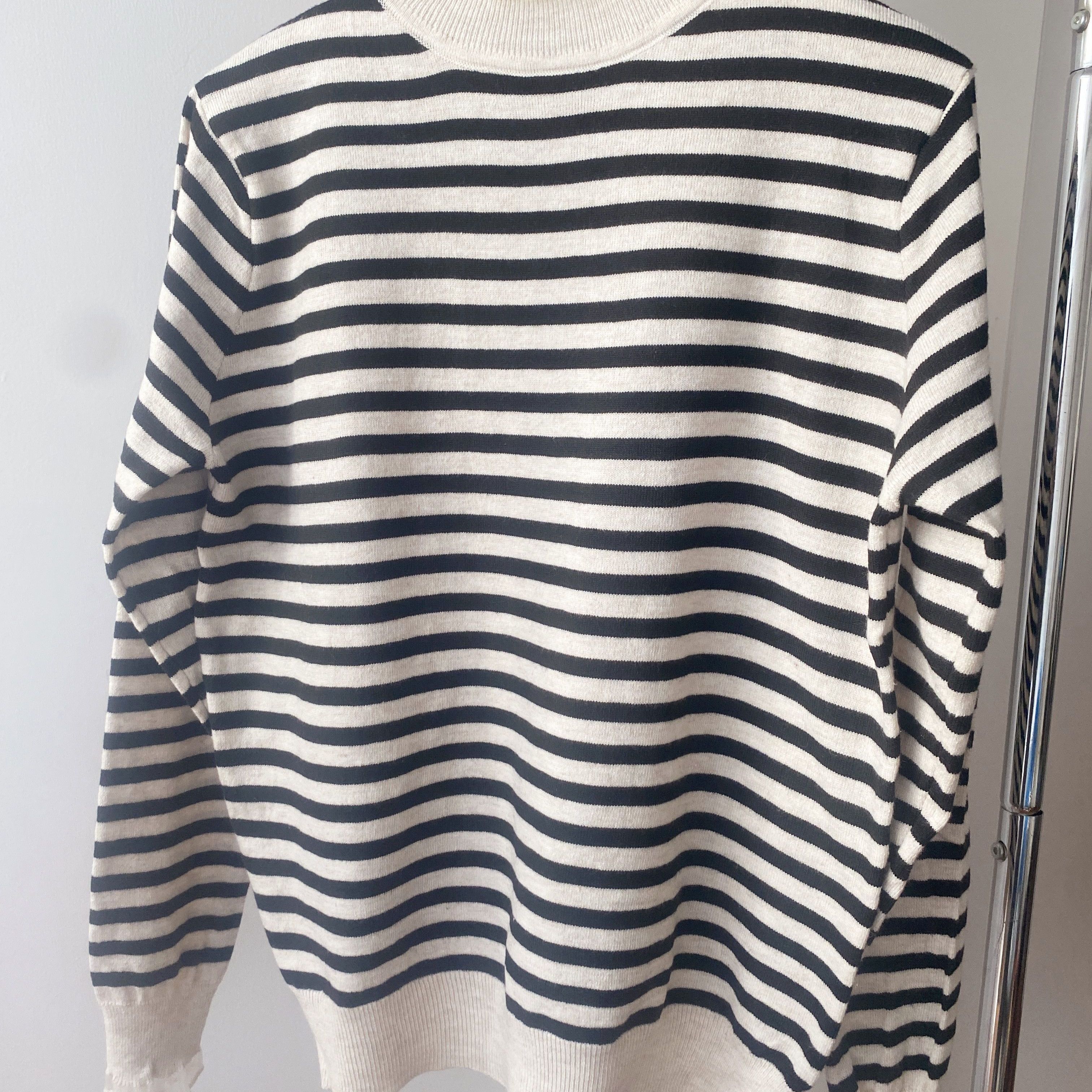 TEMU 여성용 우아한 미드 칼라 스웨터 - 고탄력 겨울 보온, 블랙 & 화이트 가로 줄무늬, 캐주얼부터 세미포멀까지, 기계세탁 가능, 다재다능한 가을 겨울 여성 스웨터