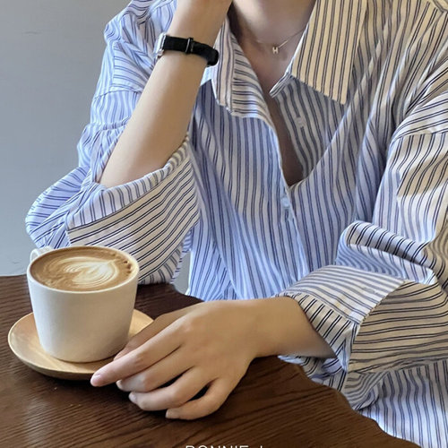 보니제이 / 벌룬핏 빅사이즈 롱 셔츠 블루 스트라이프 루즈핏 데
