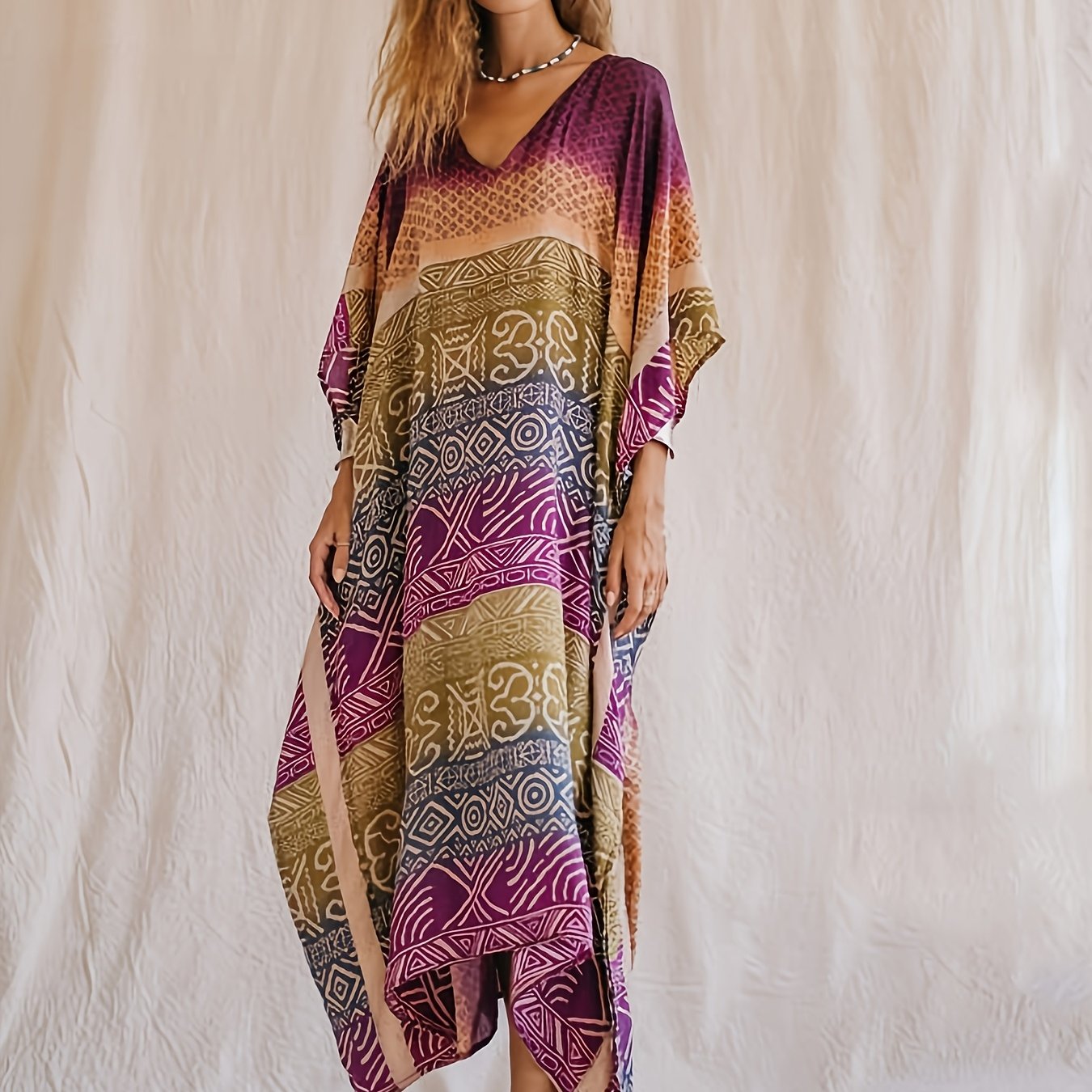 TEMU 플러스 사이즈 올오버 프린트 V넥 박쥐소매 루즈핏 맥시 커버업 카프탄 드레스, 여성 수영복 및 의류