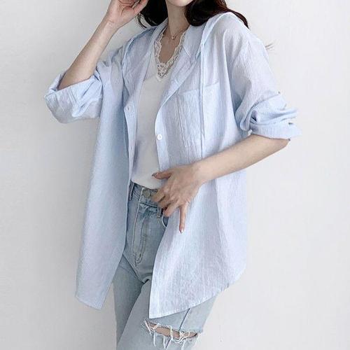 [유야]쿨 스트라이프 후드 셔츠 자켓 남방 -NB0119H- 빅사이즈 루즈핏 여성 봄 여름