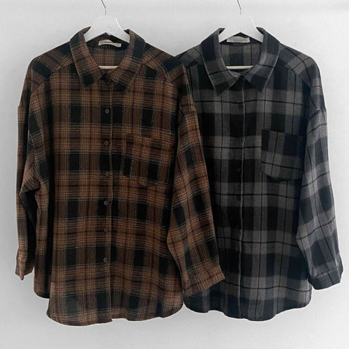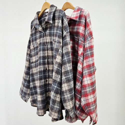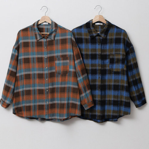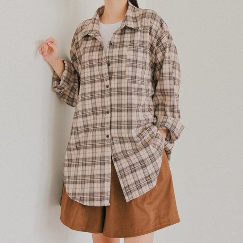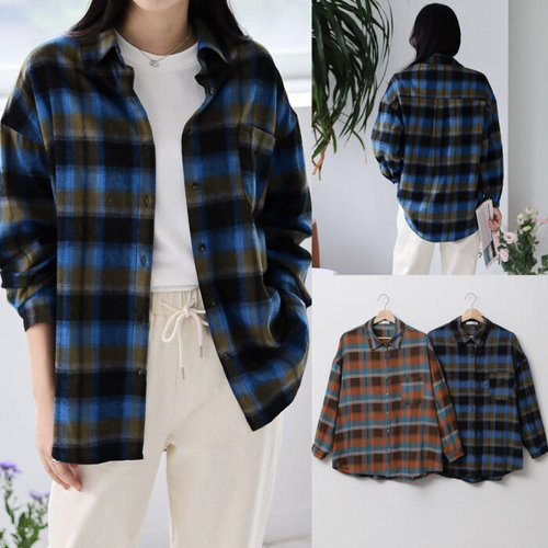 체크 오버핏 박스 카라 남방 긴팔 여성 빅사이즈