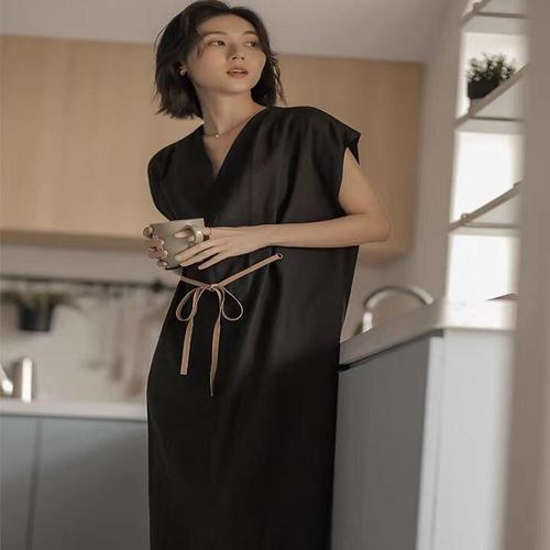 TEMU 여성용 우아한 미디 원피스 - 민소매 라인 드레스, 봄/여름용, 캐주얼부터 오피스웨어까지, 중간 기장, 벨티드 허리, 루즈핏, 기계 세탁 가능 단색 원피스