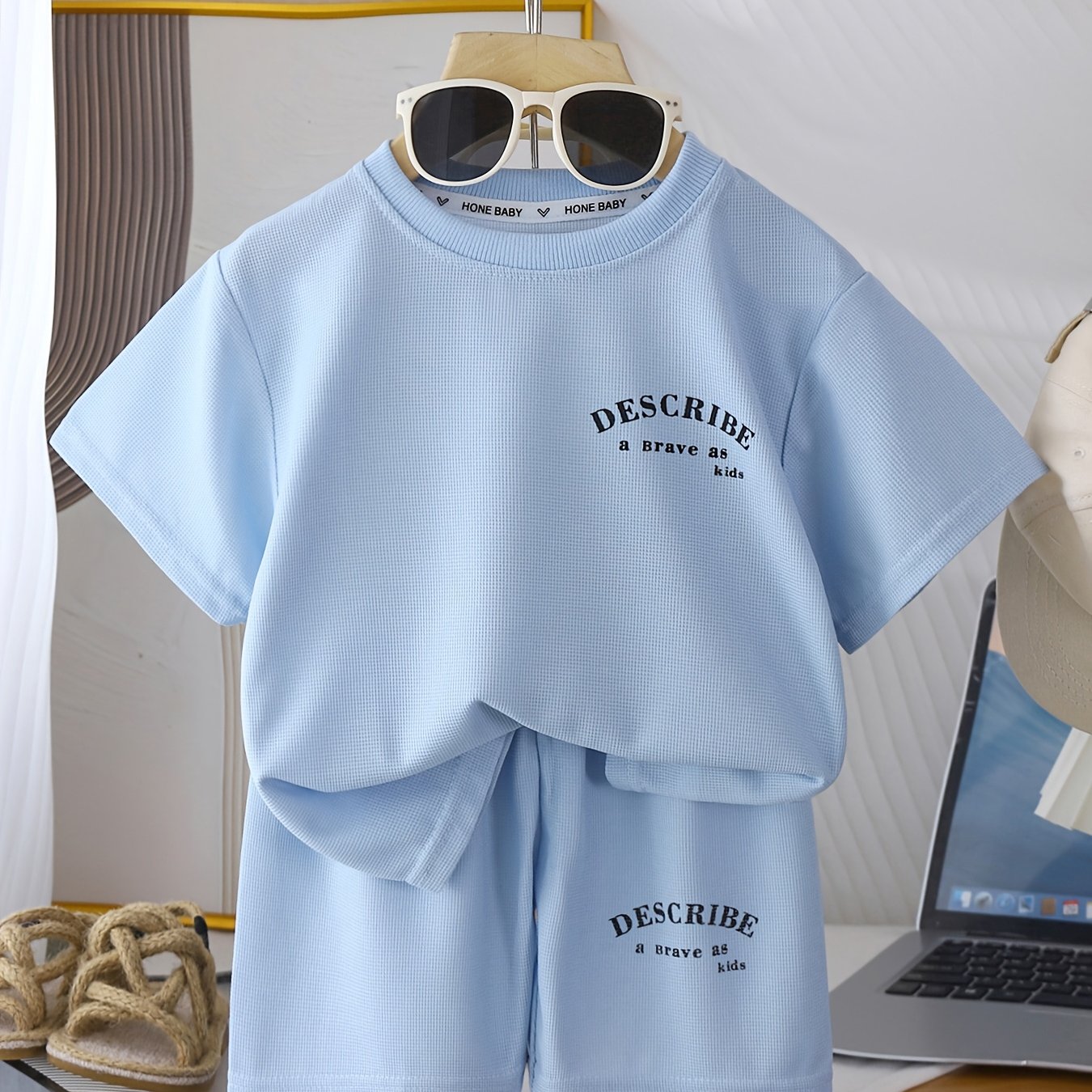 TEMU 반팔 세트 여름 신상 한국 스타일 와플 옷 남아 여아 공용 의류 투피스 세트, 야외용