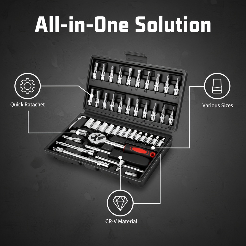TEMU 46개 전문가용 가정용 공구 키트 | 휴대용 종합 자동차, 자전거, 정비 솔루션, 수리 및 일상적인 가정용으로 적합한 고품질 내구성 금속 액세서리