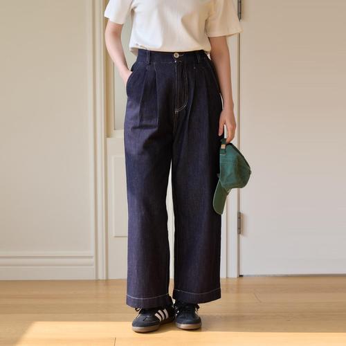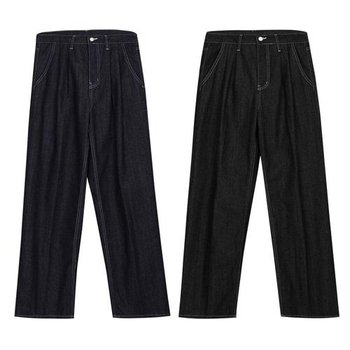 [잇수다] 미뉴얼 핀턱 롱 와이드 생지 데님 팬츠