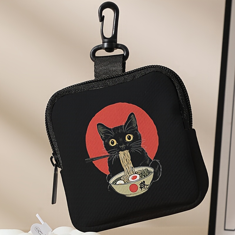 TEMU 치비 블랙 캣 레밤 먹는 디자인 지퍼 동전 지갑 - 가벼운 폴리에스터 키체인 지갑, 동전, 카드 및 작은 물건용, 빨간 배경의 귀여운 만화 고양이 일러스트레이션, 동전 지갑