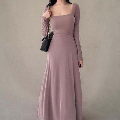 [미라클세븐]여성용 러블리 스퀘어넥 허리 스트랩 플레어 롱 드레스