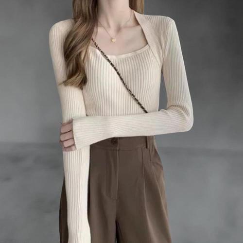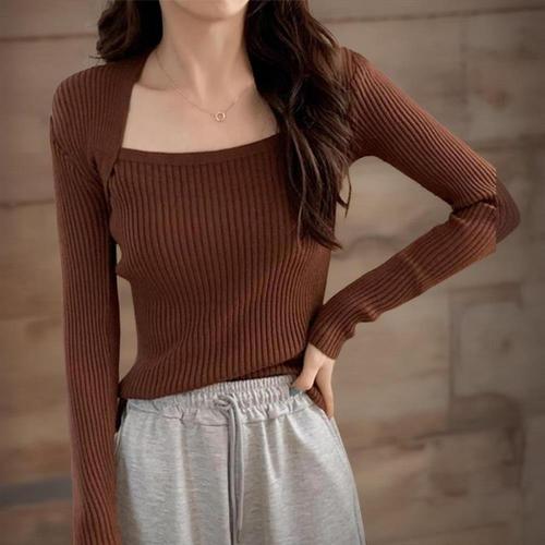 [미라클세븐]여성 슬림핏 골지 스퀘어넥 긴팔 니트 셔츠 숄더 트임