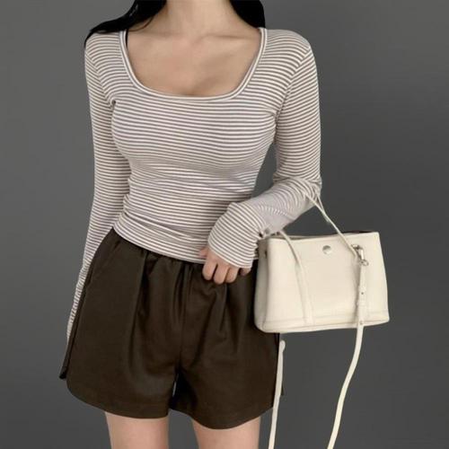 [미라클세븐]여성 글램 스타일 스트라이프 스퀘어넥 슬림핏 롱슬리브 티셔츠