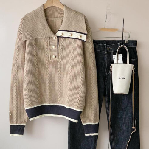 [옷자락]여성 비스코스 컬러 배색 세일러 카라넥 버튼 니트