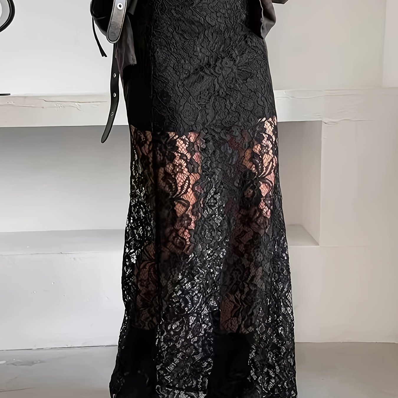 TEMU 우아한 레이스 패널 반투명 맥시 스커트 - 단색 롱드레스, 적당한 신축성, 봄 여름 가을 웨딩 파티 일상복 - 세탁기 사용 가능 스커트 NS702