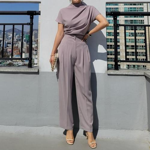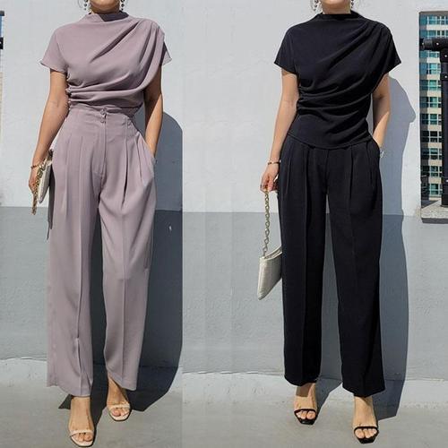 [바이어스]스판 셋업 슬랙스 투피스 밴딩 팬츠 셔링 블라우스 룩 (14671816A)