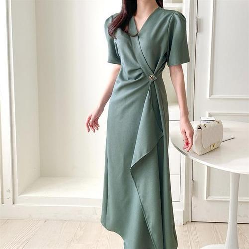 [바이어스]러플 브이넥 반팔 훌 프릴 셔링 랩 퍼프 롱 원피스 (9946844A)