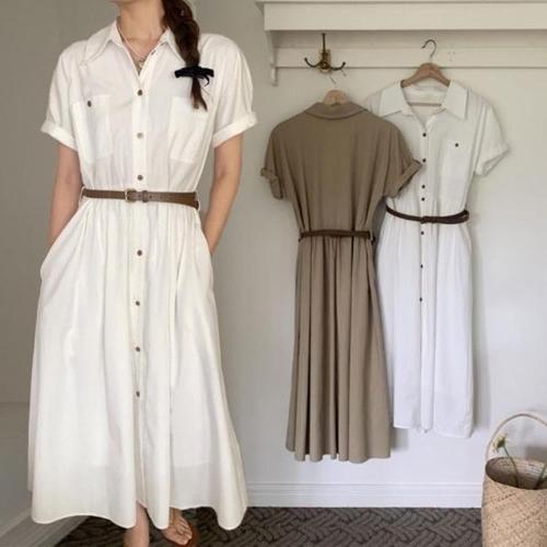 여성 심플 허리스트링 카라넥 반팔 셔츠 롱 원피스