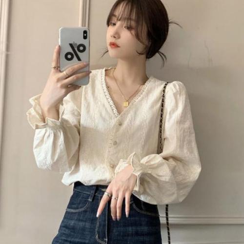 섹시한 퍼프 긴 소매 프릴 블라우스 사무실 레이디 버튼 여성 화이트 셔츠 V 넥 우아한 셔츠 여성 패션 여성 26550