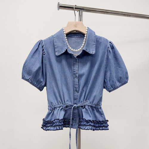미즈큐즈 / 밑단 프릴 허리 리본 퍼프소매 반팔 연청 데님 여름