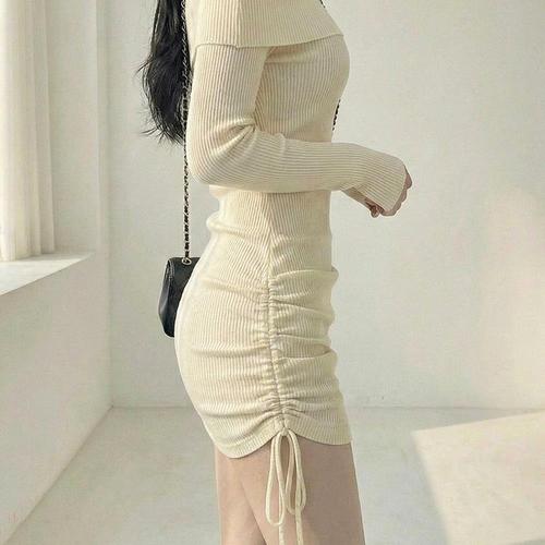 여성스러운 니트 숄더 원피스 체형커버 러블리캐쥬얼 벨트 미니 겨울