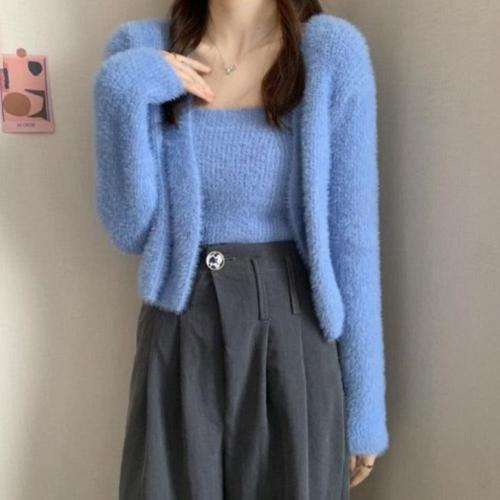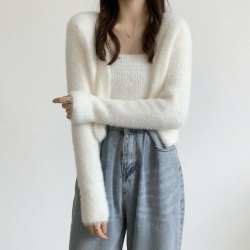 |CCD28CF|여성 슬림핏 스퀘어넥 부드러운 부클 숏 가디건 세트