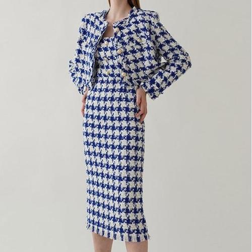 [바이어스]펄 체크 수술 트위드 셋업 숏자켓 민소매 원피스 세트 (9892374A)