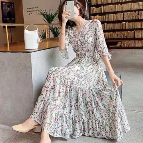 여름 여성 롱 반팔 플라워 바캉스 휴양지 쉬폰 원피스