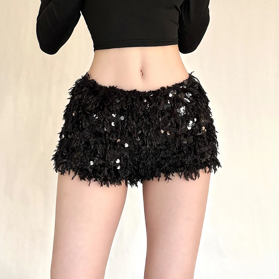 SylCue 퍼리 태슬 미니 쇼츠 여성용 2026 신상 스타일 스팽글 패치워크 탄력 허리 스윗 걸즈 스트리트 패션 우아한 하의
