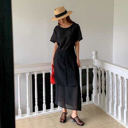 [옷자락] 여자 쉬폰 레이어드 슬릿 반팔 랩 스커트 롱 원피스