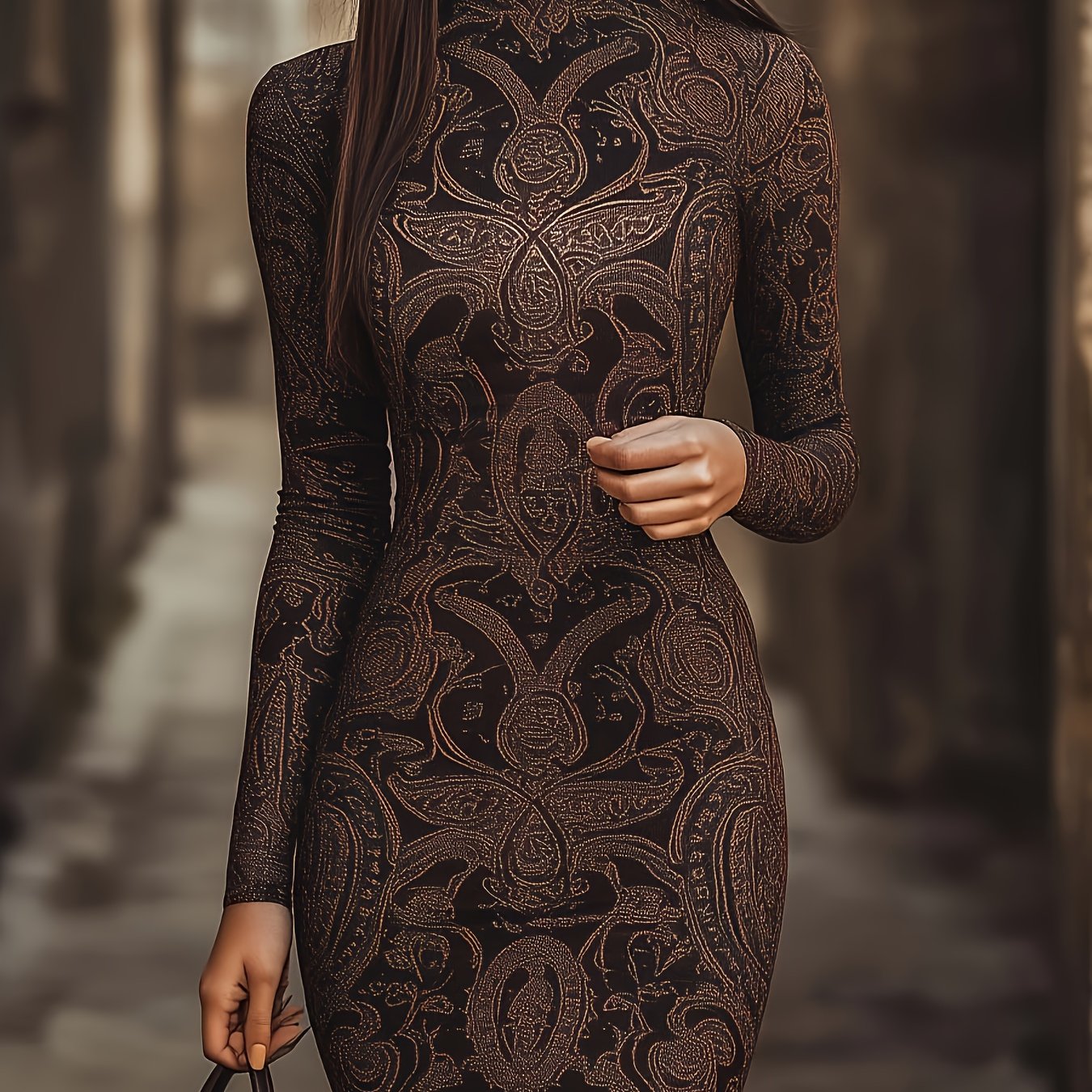 TEMU 2025 가을 신상품 유럽 및 미국 스타일 여성용 라운드 넥 긴소매 프린트 슬림핏 엘레강스 드레스