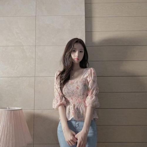 [에이치플러스몰]스퀘어넥 벌룬소매 스모크밴딩 반팔블라우스 NF-57