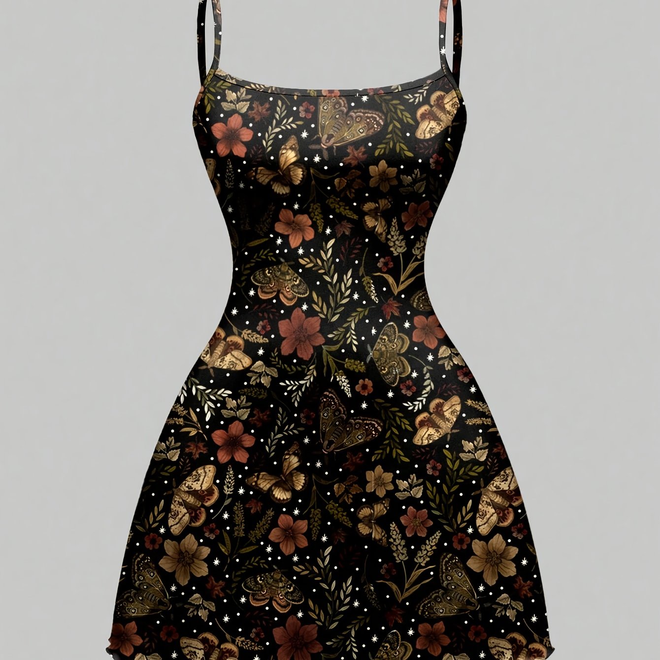 TEMU 귀여운 나방 나비 플로럴 식물 가을 단풍잎 달 별 풀 프린트 캐미솔 드레스