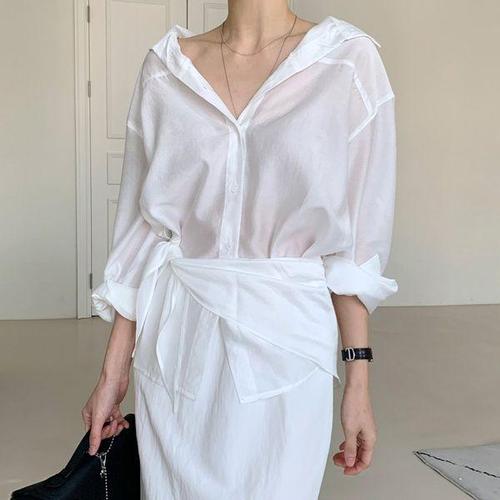 [유야]투웨이 스카프 시스루 셔츠 블라우스 쉬폰 허리끈 남방 -NB0116H- 빅사이즈 루즈핏 여성 봄 여름