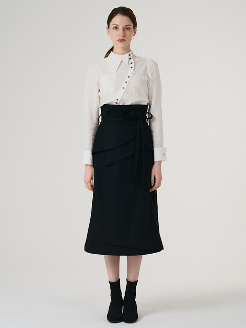 [프릭스] 캐시미어 하이웨이스트 컷팅 엣지 구조적인 레이어드 랩 스커트_블랙