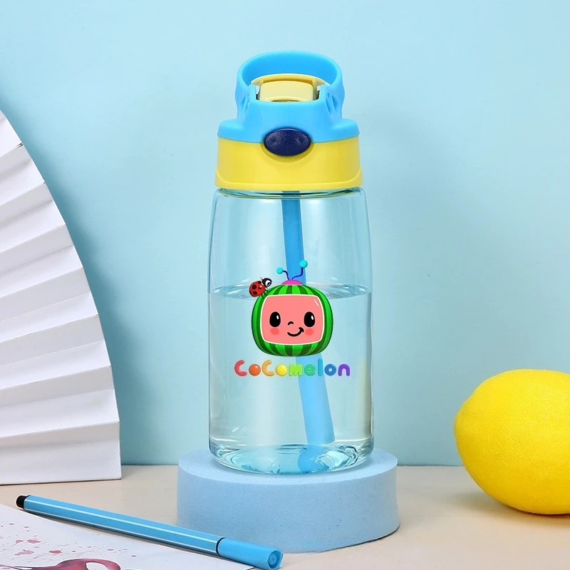 Cocomelons 투명한 물병 빨대가있는 물 컵 소년 소녀 학생 용품 안티 가을 스포츠 휴대용 병 선물