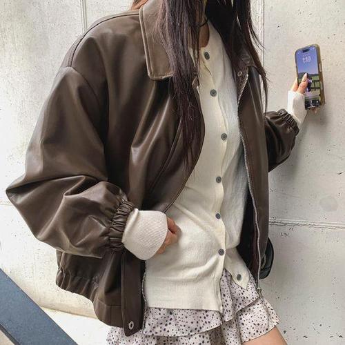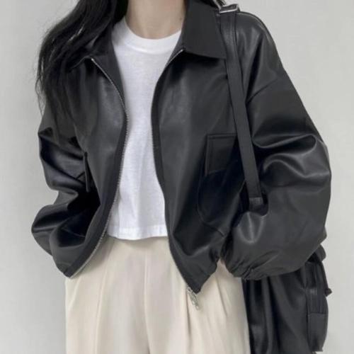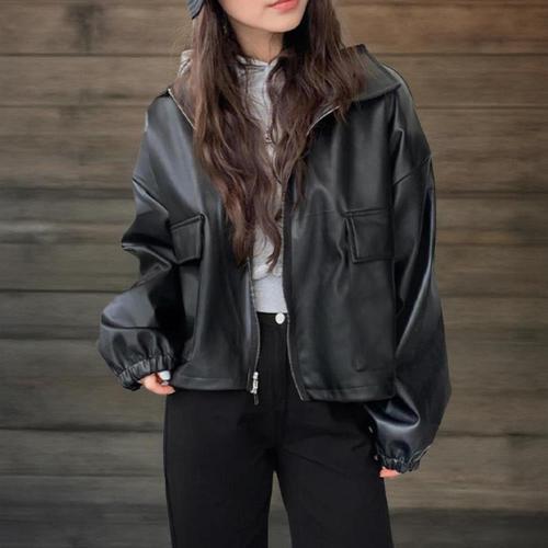 [신상오픈런]여성 루즈핏 가죽 카라 자켓 힙무드 스타일