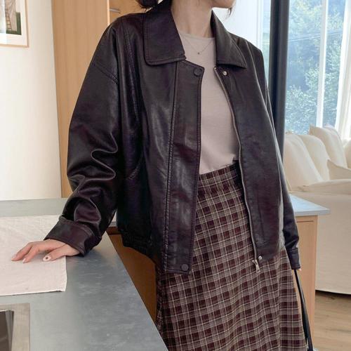 [신상오픈런]여성용 가을 오버핏 카라넥 가죽 집업 자켓 버튼 스타일