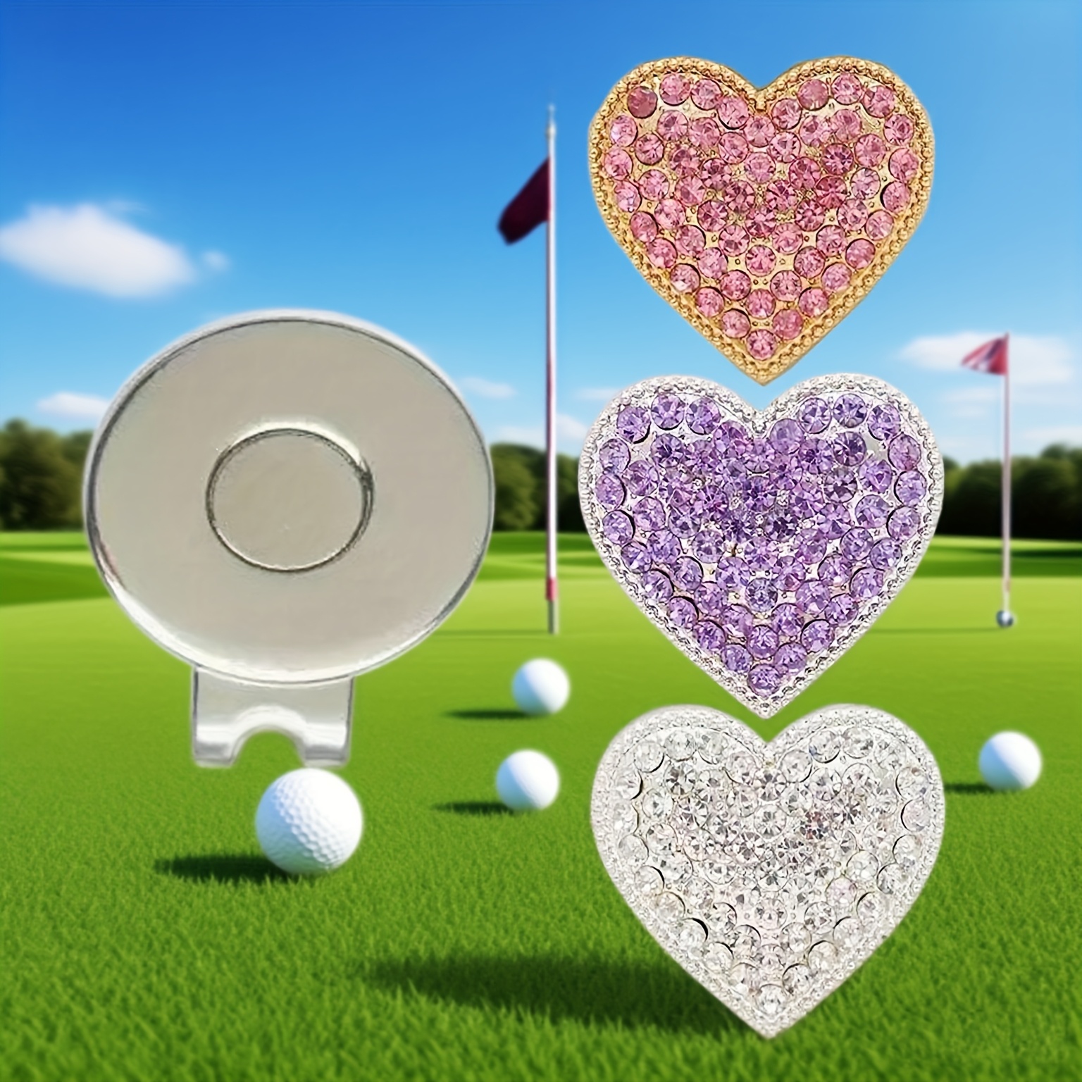 TEMU 3개 세트 반짝이는 하트 골프공 마커 - 자석 금속 골프 모자 클립 포함, 골프 코스에 필수적이고 사용하기 편리함, 골프 애호가를 위한 이상적인 선물