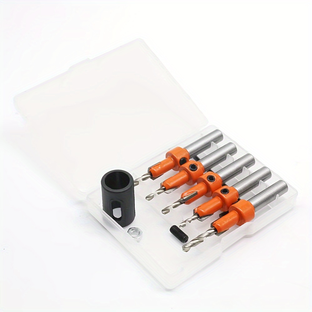 TEMU 5pcs 드릴 비트 세트, 교체 가능한 센터 드릴이 포함된 네면 HSS مخروط형 드릴 비트, 베어링 및 고무 링 제한 링, 터치 우드 스톱, 패널 표면 손상 없음, 1/4 인치 헥스 샤크, 스크루 설치 드릴링, 숨은 스크루에 적합